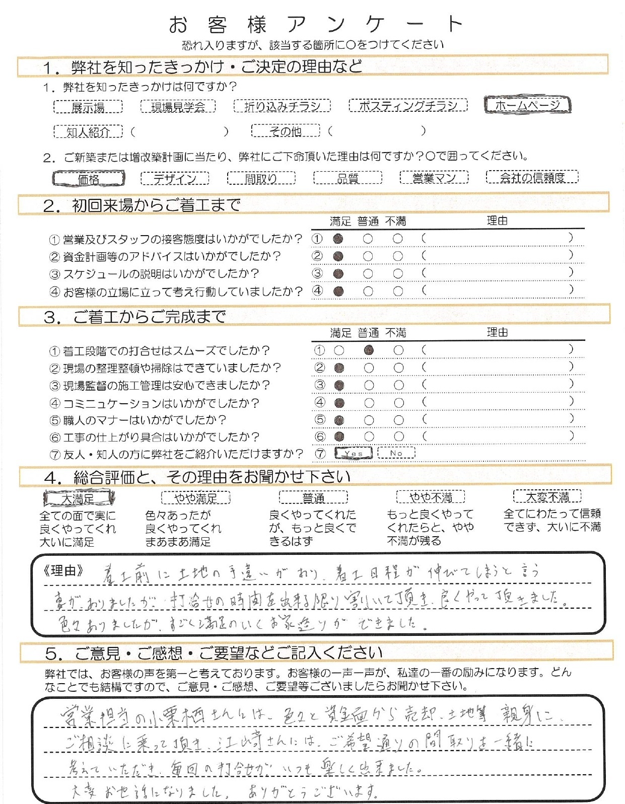 着工前に土地の手違いがあり、着工日程が伸びてしまうと言う事がありましたが、打合せの時間を出来る限り割いて頂き、良くやって頂きました。