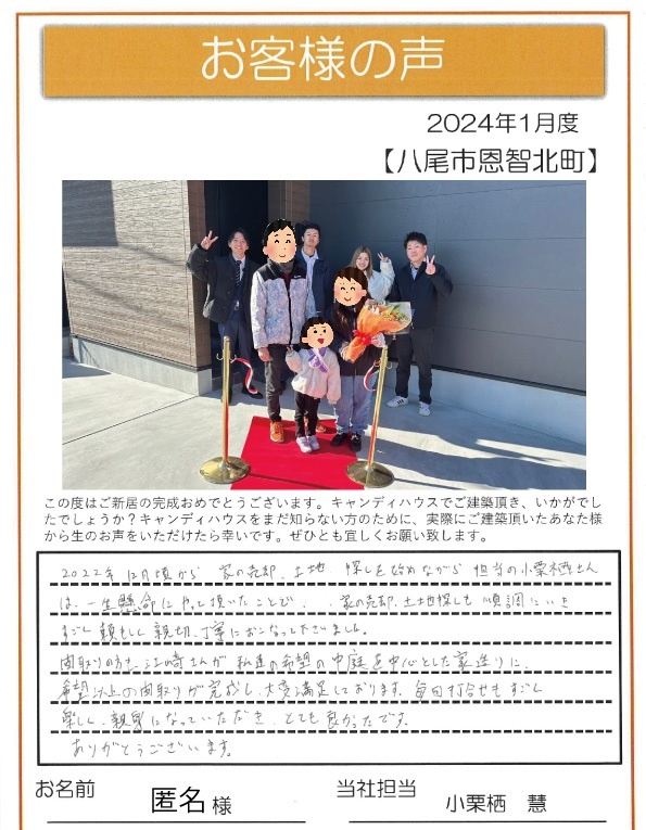 営業担当の小栗栖さんには、色々と資金面から売却、土地等 親身にご相談に乗って頂き、江崎さんには、ご希望通りの間取りを一緒に