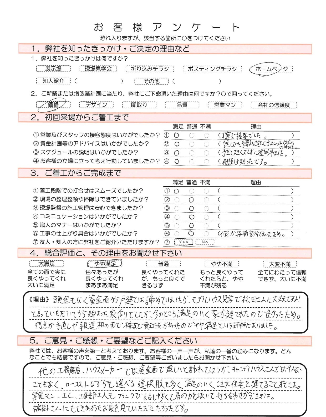 他の工務店、ハウスメーカーでは資金面で厳しいと言われてしまうが、キャンディハウスさんではそんなこともなく、ローコストながらも選べる選択肢も多く満足のいく注文住宅を建てることができた。