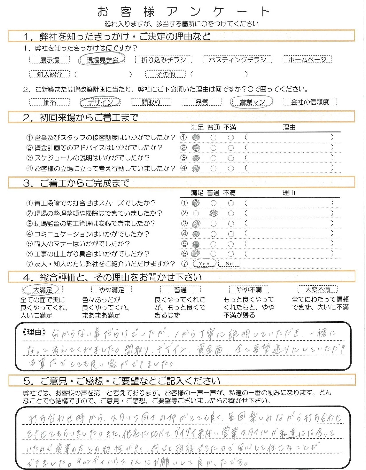 間取り、デザイン、資金面、全て要望通りにしていただき予算内でとても良い家ができました。