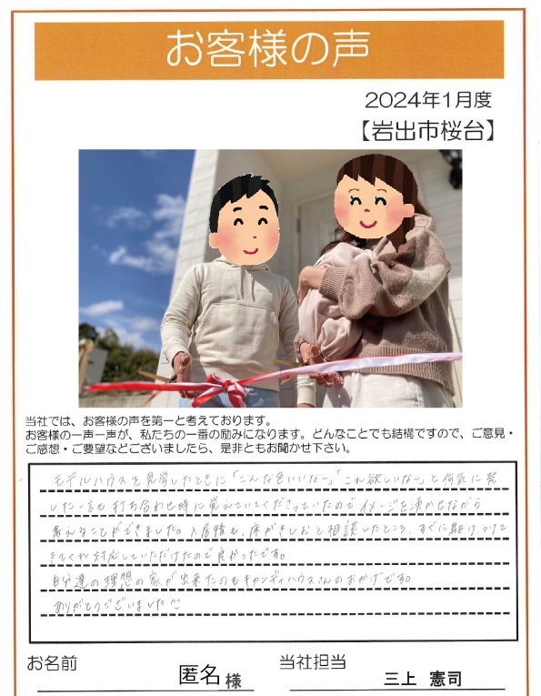 自分達の理想の家が出来たのもキャンディハウスさんのおかげです。ありがとうございました☺