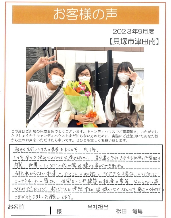 自宅が貝塚なので、貝塚店で打ち合わせが毎回できたらよかったかなぁと思います。