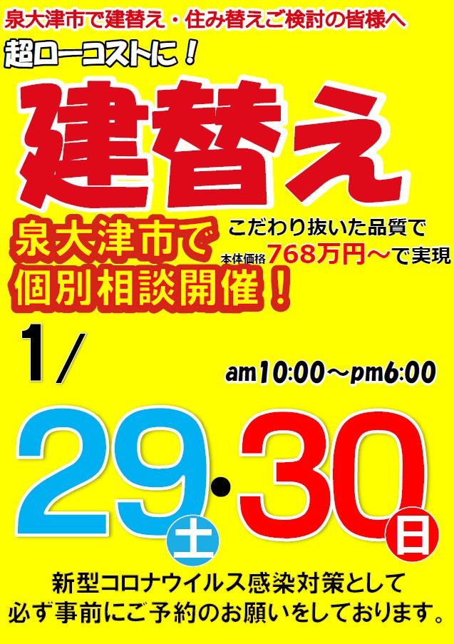 2022年1月29日(土),30日(日) 泉大津市我孫子 建替え相談会開催!
