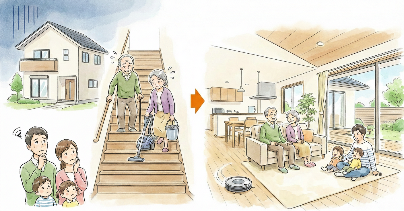 階段事故の心配がないバリアフリーな暮らし。高気密・高断熱な構造で、冬場のヒートショックのリスクも軽減します。