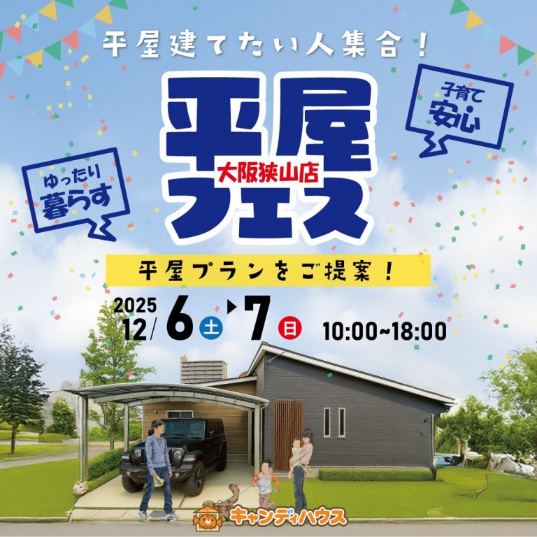 2025年12月6日(土),7日(日) 大阪狭山店☆★平屋フェス開催★☆ 今!若い方から年配の方まで平屋が人気!! 🌟今、平屋が選ばれる理由🌟 ✅ バリアフリーで将来も安心 ...